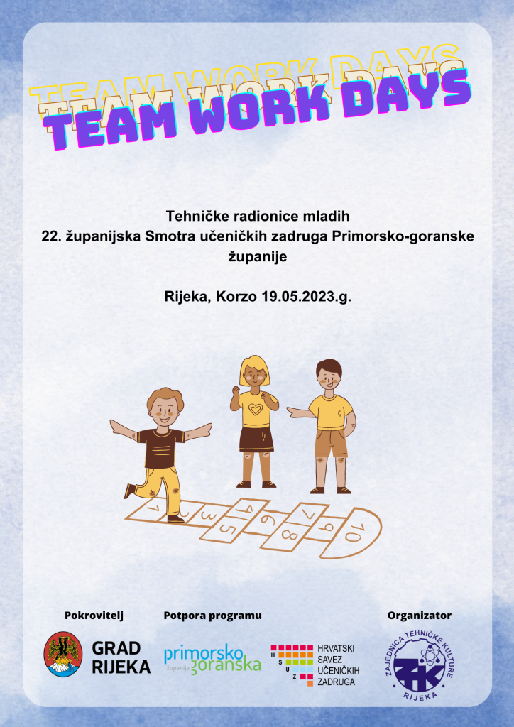 U petak 19. svibnja na Korzu će se održati manifestacija Team work days, pod pokroviteljstvom Grada Rijeke i uz potporu Primorsko-goranske županije. Organizator manifestacije je Zajednica tehničke kulture Rijeka u suradnji s Hrvatskim savezom učeničkih zadruga-Podružnicom Primorsko-goranske županije. Program XXII. Smotre učeničkih zadruga održava se od 10.00 do 14.00 sati, dok je svečano otvaranje manifestacije uz program predviđeno u 10.00 sati.